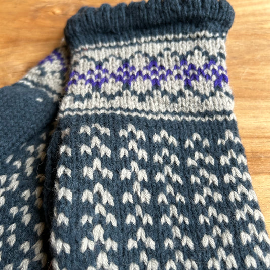Zili merino vilnas dūraiņi ar baltiem un brūniem ornamentiem (RABE 85)