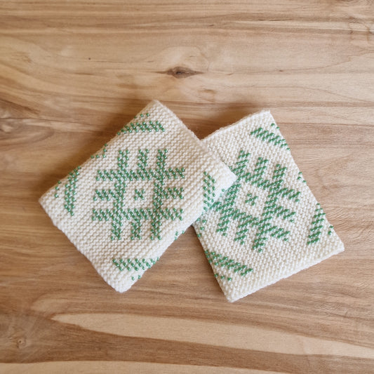 Balti merīnvilnas mauči/pulsa sildītāji ar maigi zaļām pērlīšu akas zīmēm (ANLA 22)