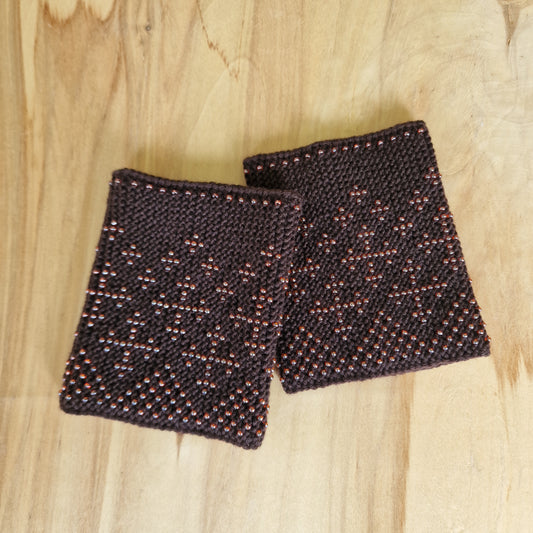 Tumši brūni merīnvilnas mauči/pulsa sildītāji ar oranžu pērlīšu Māras krustiem (ANLA 37)