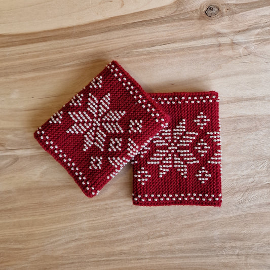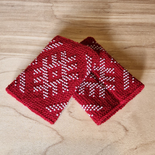 Tumši sarkani merīnvilnas mauči/pulsa sildītāji ar baltu pērlīšu akas zīmēm (ANLA 30)