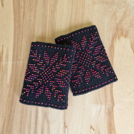Melni merīnvilnas mauči/pulsa sildītāji ar rozīgi sarkanu nokrāsu pērlīšu Ausekļa zīmēm (ANLA 40)