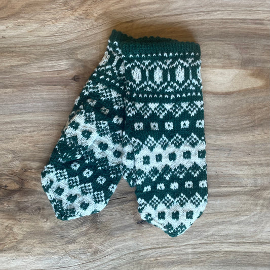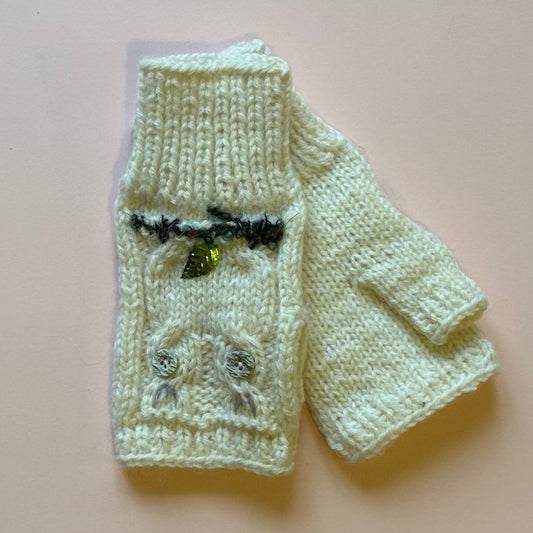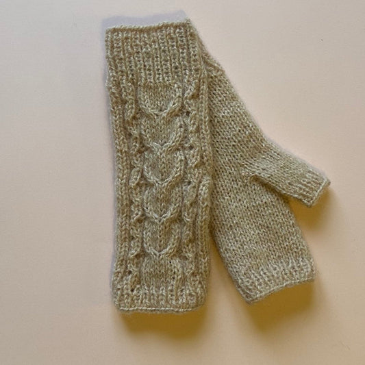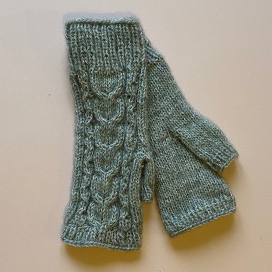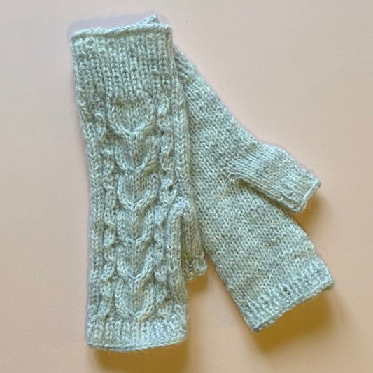 Rokām adīti gaiši pelēkzaļi pirkstaiņi ar mežģīņu lapiņas rakstu plaukstas virspusē (INVA 50)