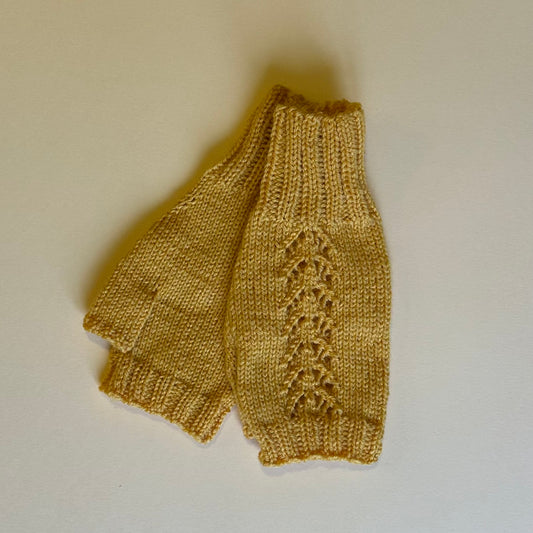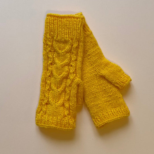 Rokām adīti dzeltenzaļi pirkstaiņi ar rombiņu rakstu plaukstas virspusē (INVA 47)