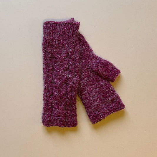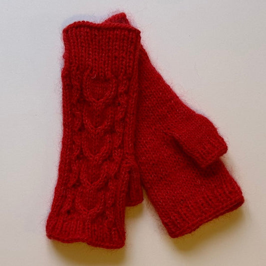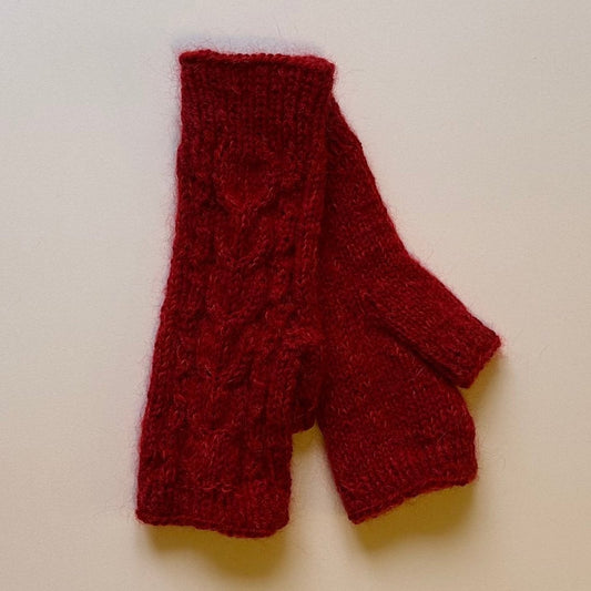 Rokām adīti tumši sarkani pirkstaiņi ar skujiņas rakstu plaukstas virspusē (INVA 49)