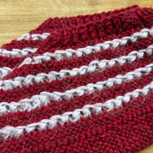 Adītas vilnas čībiņas 36.-38.izm. tumši sarkanas ar gaiši rozā strīpiņu (DAKU 31)