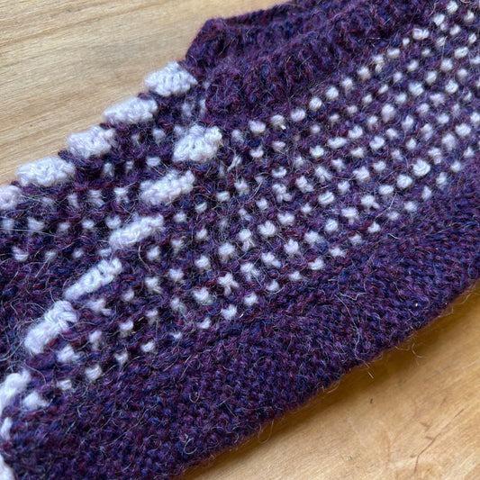 Adītas vilnas čībiņas 36.-38.izm. tumši lillā krāsā ar baltu rakstiņu (DAKU 28)