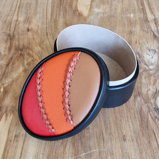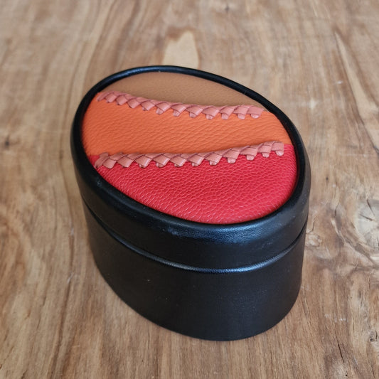 Melna dekoratīvā ādas kārba ar brūni / oranži / sarkanu vāku / ovāla L (RARA 222)