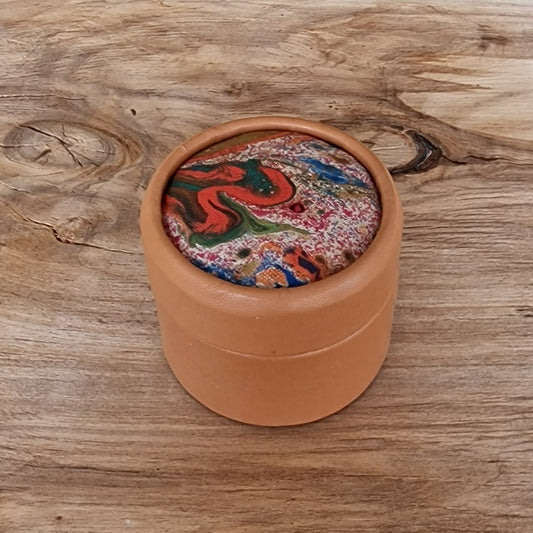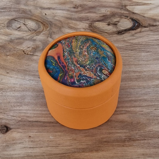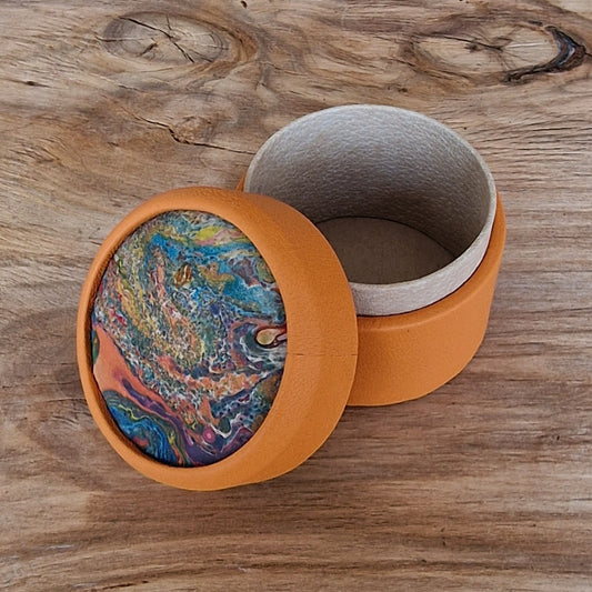 Oranža, apaļa dekoratīva ādas kārbiņa (S) ar raibi marmorētu vāku (RARA 212)