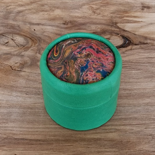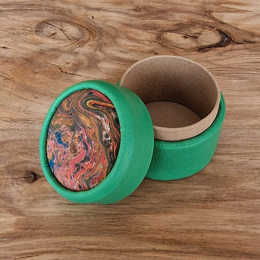 Zaļa, apaļa dekoratīva ādas kārbiņa (S) ar dažādu krāsu marmorētu vāku (RARA 208)