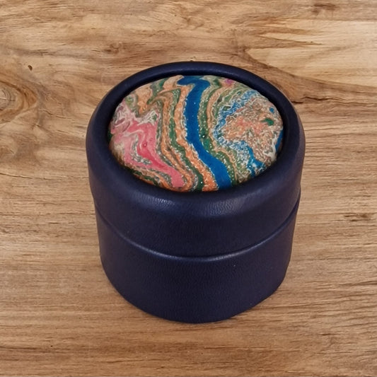 Zili violeta, apaļa dekoratīva ādas kārbiņa (S) ar zili rozīgi marmorētu vāku (RARA 206)