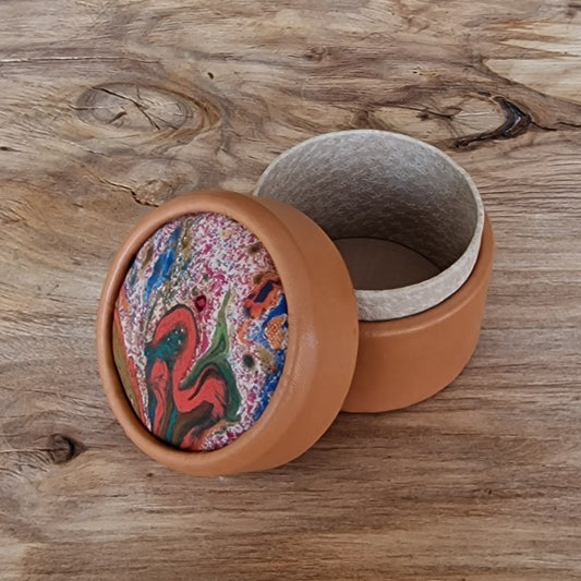 Ādas krāsas, apaļa dekoratīva ādas kārbiņa (S) ar dažādu krāsu marmorētu vāku (RARA 207)