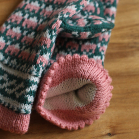 Rozā merino vilnas dūraiņi ar baltiem un zaļiem ornamentiem (RABE 84)