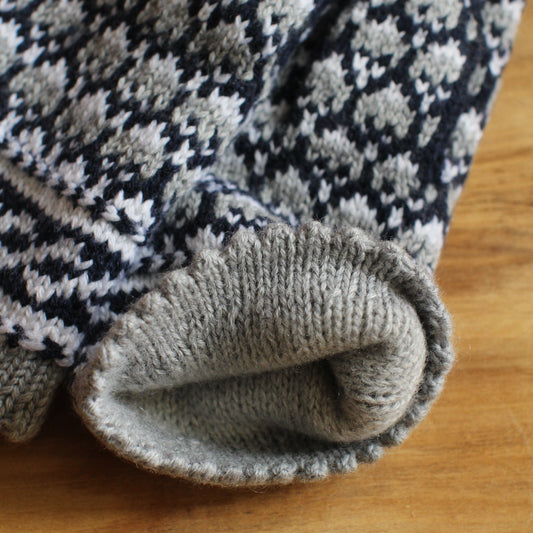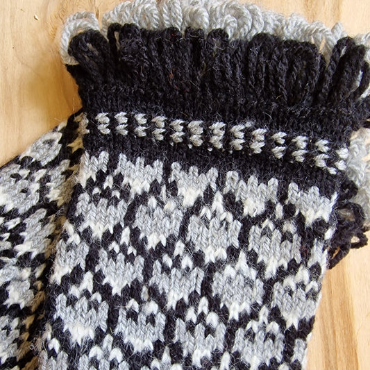 Pelēki merino vilnas dūraiņi ar baltiem un melniem ornamentiem (RABE 86)
