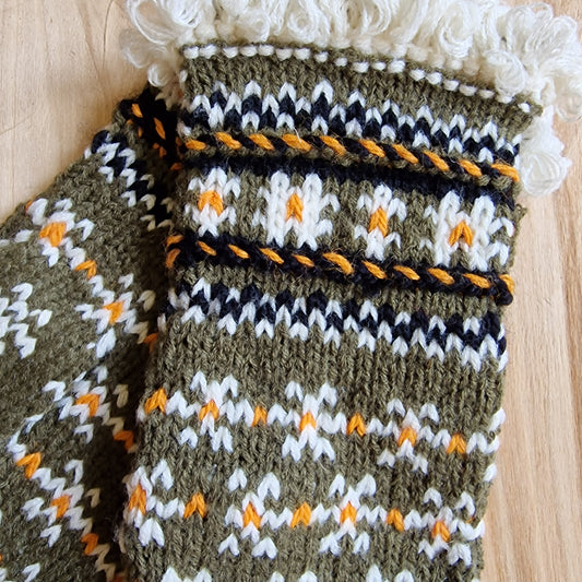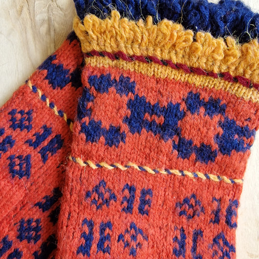 Zili merino vilnas dūraiņi ar baltiem un brūniem ornamentiem (RABE 85)