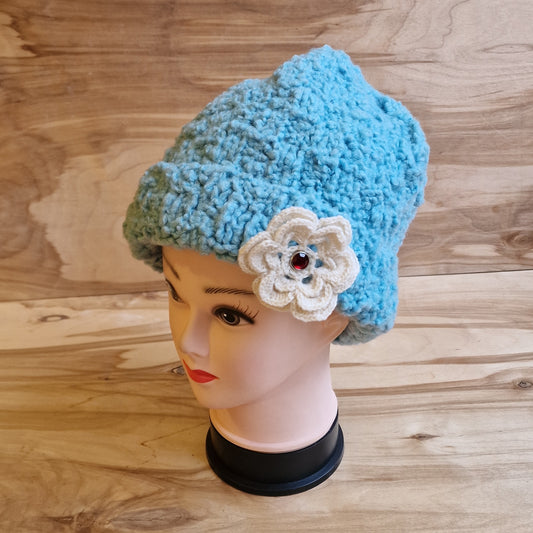 Rokām adīta gaiši zila cepure ar gaišu ziedu (DZTO 69)