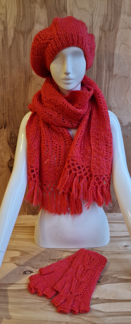 Rokām adīts mīkstas dzijas komplekts maigi sarkanrozā krāsā - šalle, berete, puscimdi (DZTO 89)
