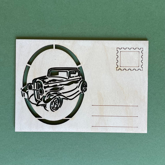 Saplākšņa pastkarte ar izfrēzētu auto un uzrakstu (RAJO 46)