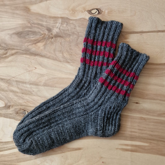 Vilnas zeķes 37.-39.izm. pelēkas ar tumši sarkanām svītrām (MĀST 28)