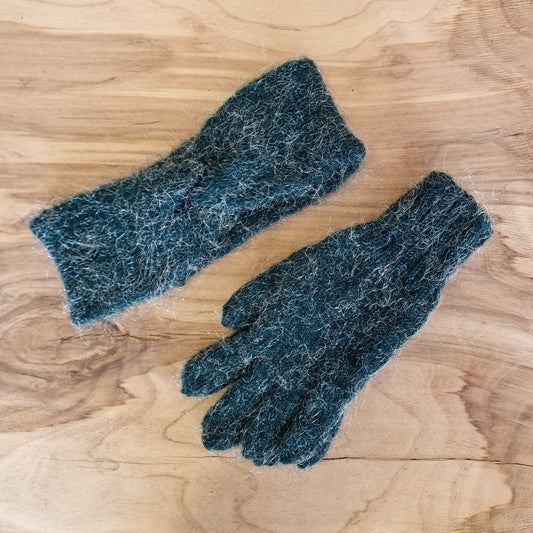 Rokām adīts komplekts - ausaine un pirkstaiņi t.zaļi ar sudraba "matiņiem" (MAŅI 13)