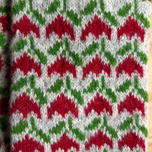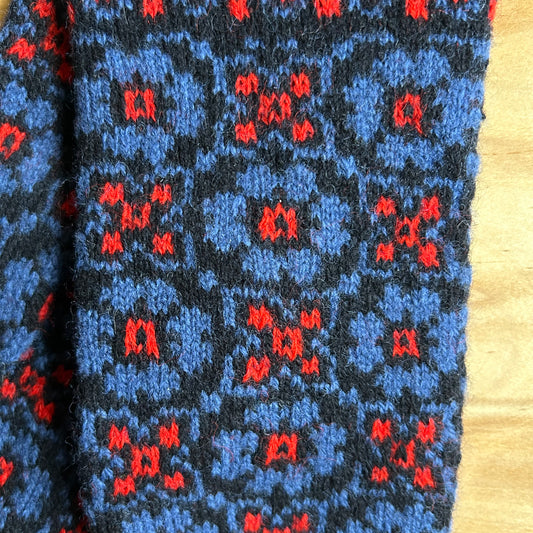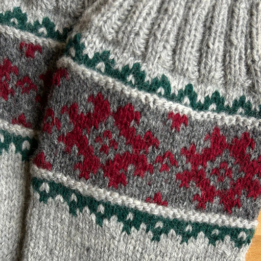 Siltās zeķes 43.-45.izm. pelēkas zeķes ar sarkaniem, tumši pelēkiem un zaļiem ornamentiem (MALI 47)