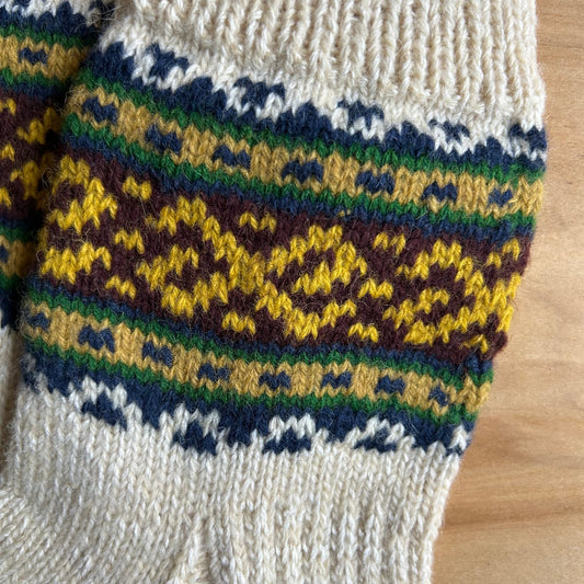 Siltās zeķes 43.-45.izm. gaišas zeķes ar brūniem, dzelteniem un zaļiem ornamentiem (MALI 53)