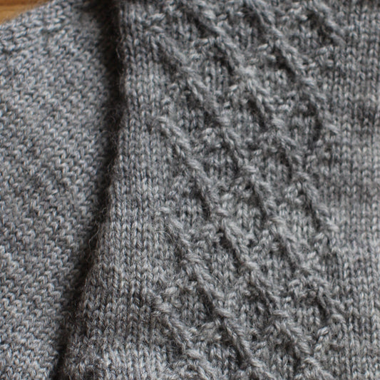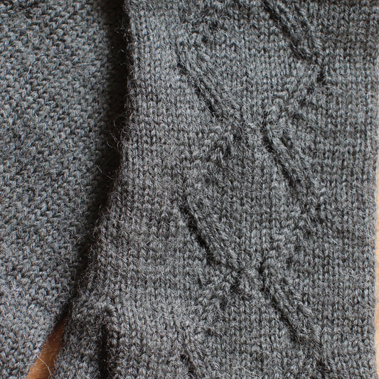 Rokām adīti tumši pelēki pirkstaiņi ar mežģīņu romba rakstu plaukstas virspusē (INVA 35)