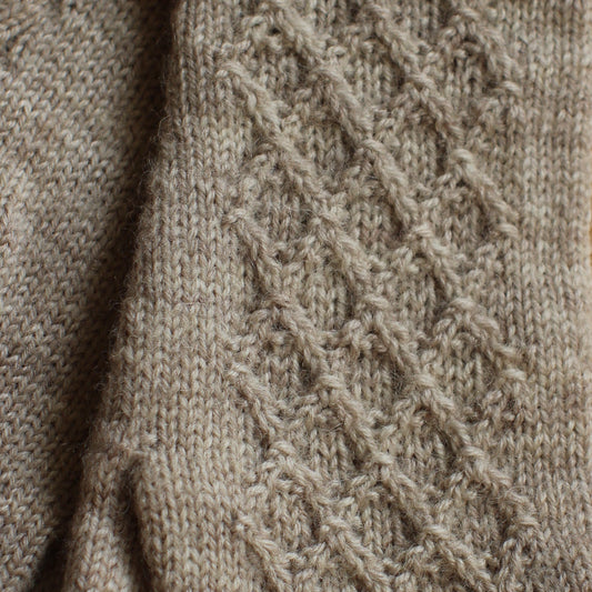 Rokām adīti smilškrāsas pirkstaiņi ar lielāku rombiņu rakstu plaukstas virspusē (INVA 46)