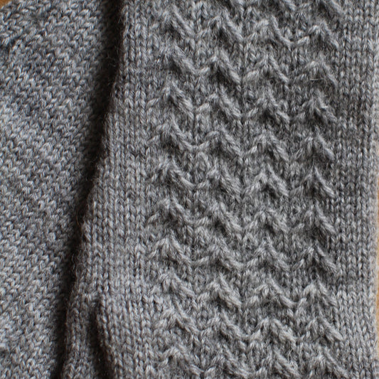 Rokām adīti gaiši pelēki pirkstaiņi ar skujiņas rakstu plaukstas virspusē (INVA 41)