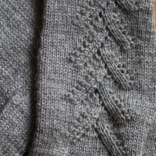 Rokām adīti tumši pelēki pirkstaiņi ar mežģīņu skujiņas rakstu plaukstas virspusē (INVA 36)