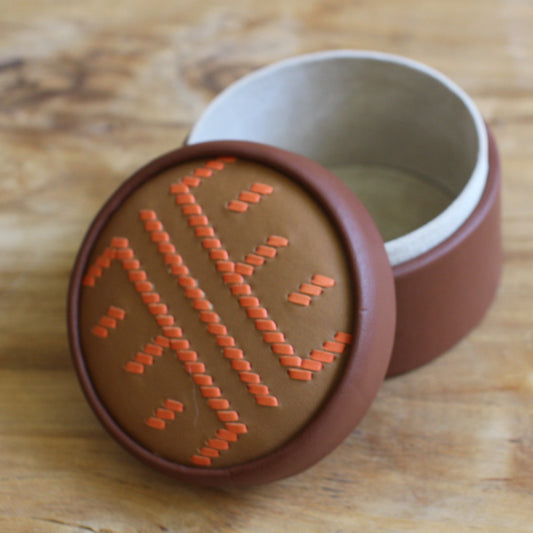Brūna, apaļa dekoratīva ādas kārbiņa latviešu etnogrāfisko zīmju rakstu (RARA 256)