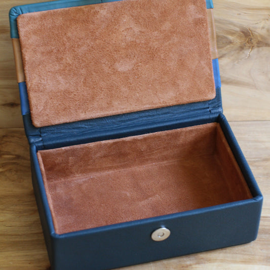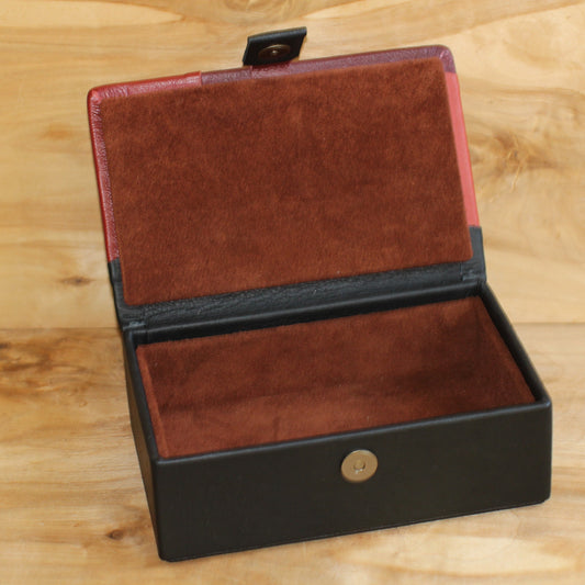 Sarkana, apaļa dekoratīva ādas kārbiņa (S) ar zilgani marmorētu vāku (RARA 252)