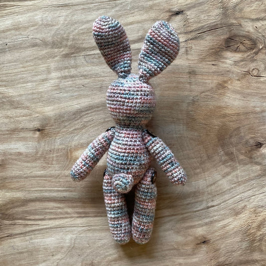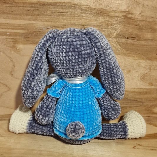 Tamborēta rotaļlieta - pelēks zaķis ar zilu krekliņu (AIPU 61)
