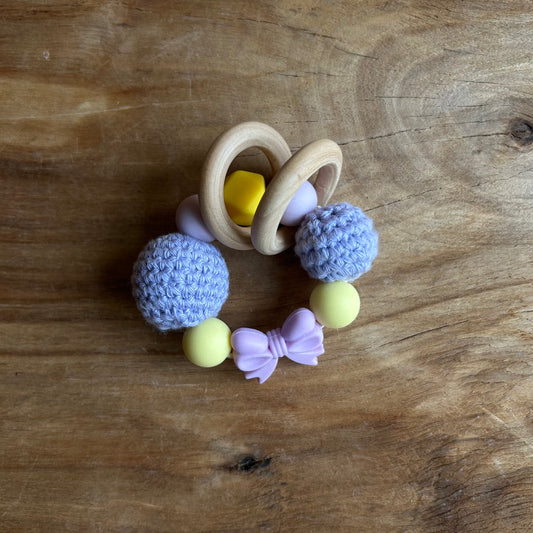 Tamborēts grabulītis lillā krāsā ar rozā silikona banti (AIPU 140)
