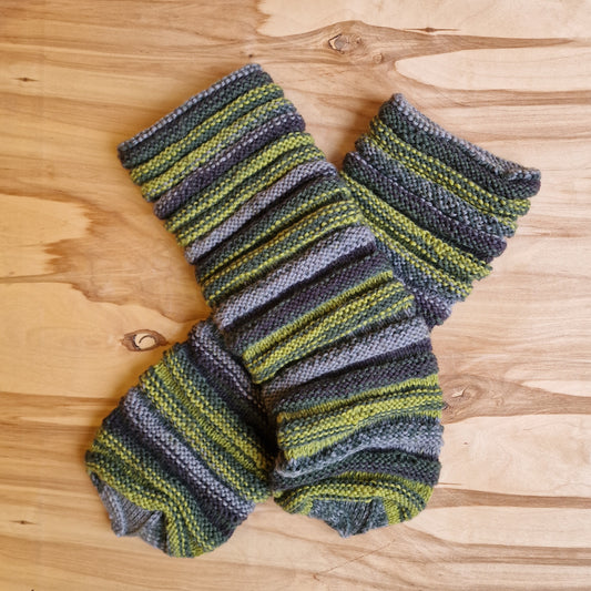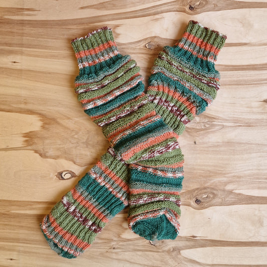 Rokām adītas bezpapēžu zeķes zaļgan sarkanās krāsās (RECE 51)
