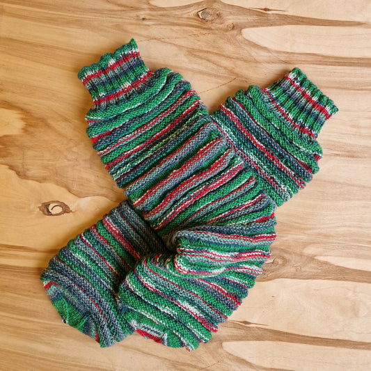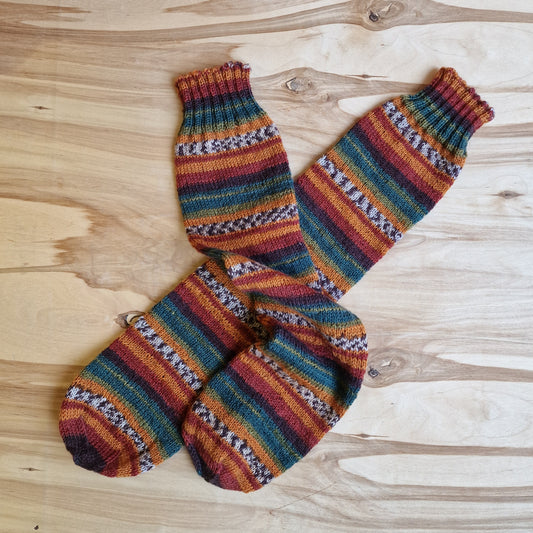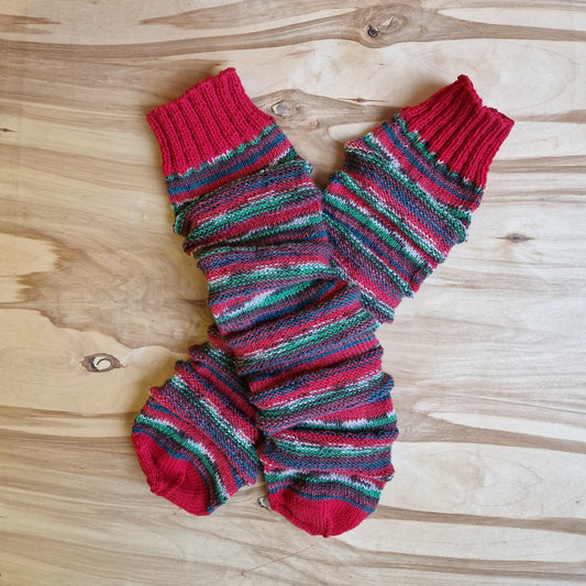 Rokām adītas bezpapēžu zeķes sarkani zaļganos toņos (RECE 54)