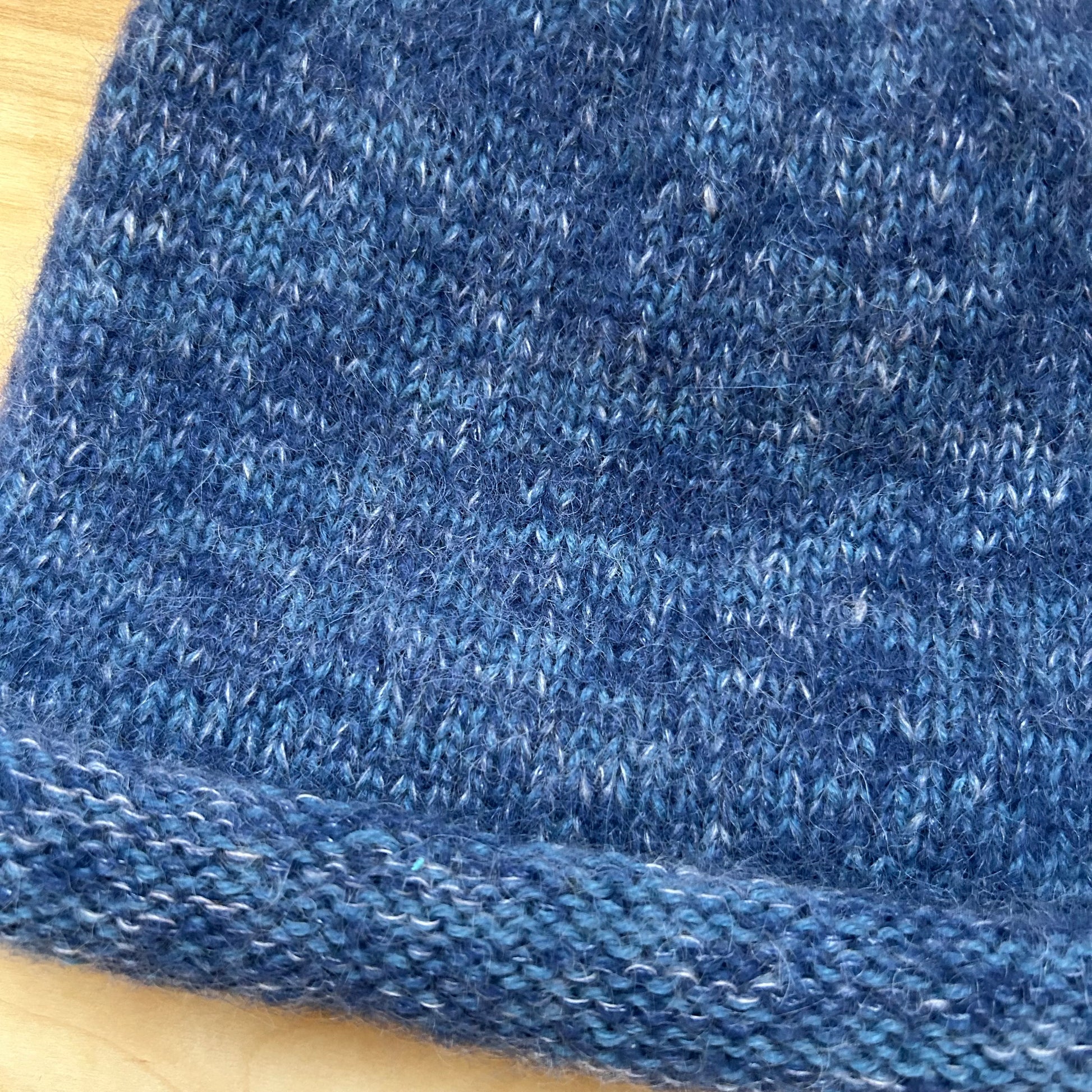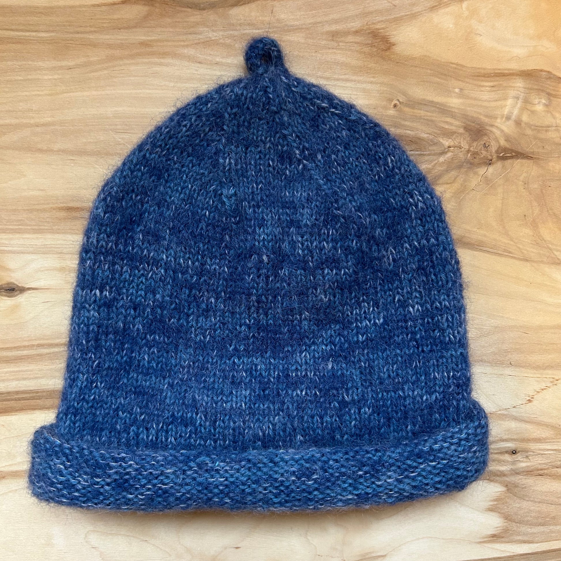 Rokām adīta ziemas cepure no mīkstas kidmohēras dzijas tumši zilā krāsā ar cilpiņu augšdaļā.