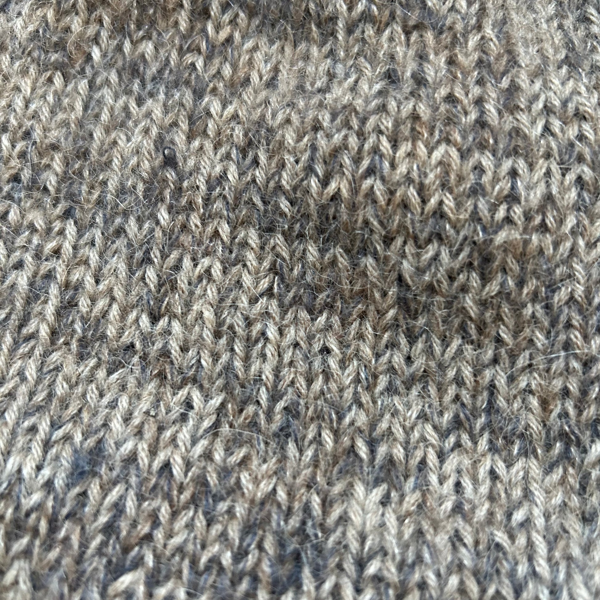 Rokām adīta ziemas cepure no mīkstas kidmohēras dzijas brūnā krāsā ar cilpiņu augšdaļā.