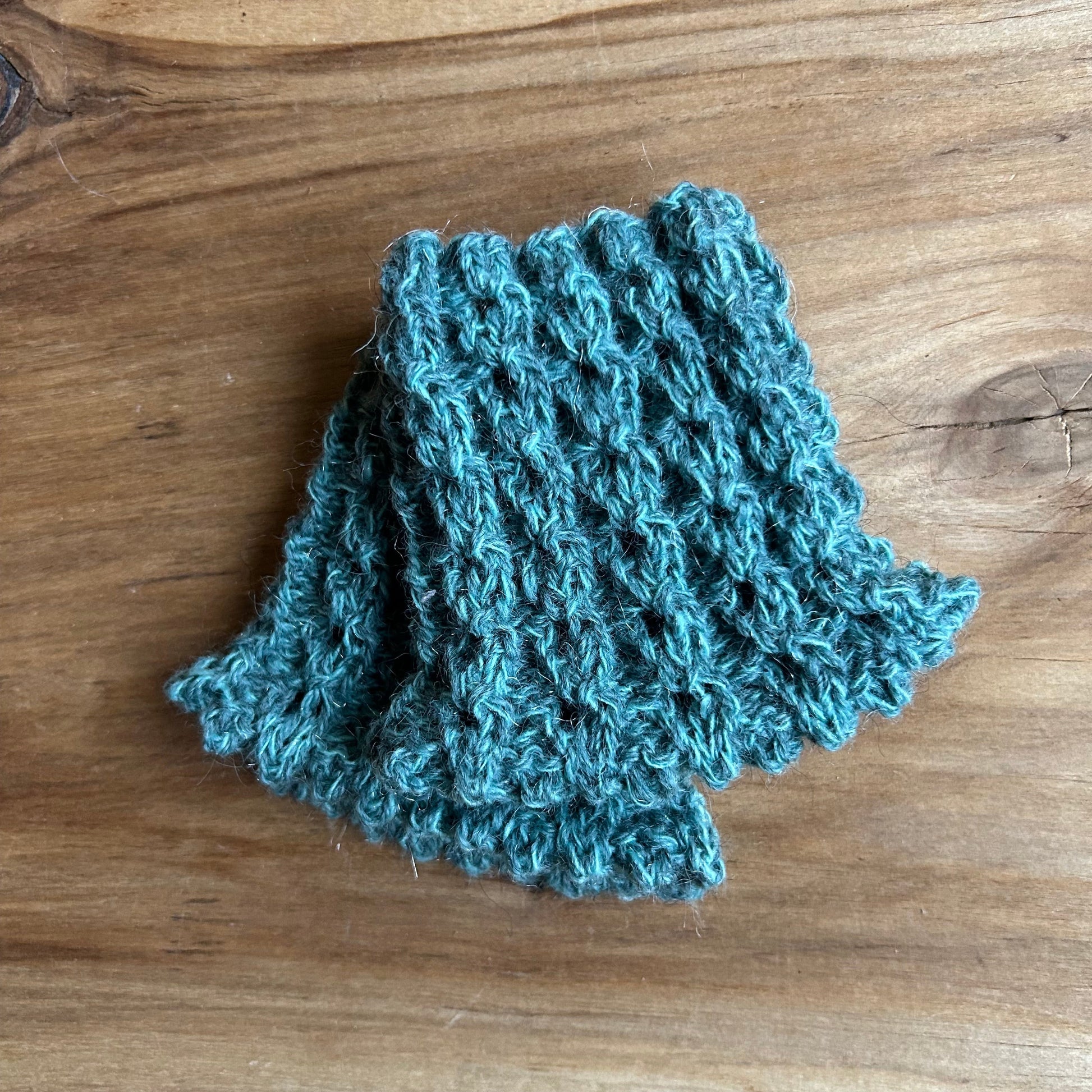 Rokām adīti mauči jeb pulsa sildītāji zili pelēkā krāsā. Izmērs - 10 cm augstums un 8cm platums