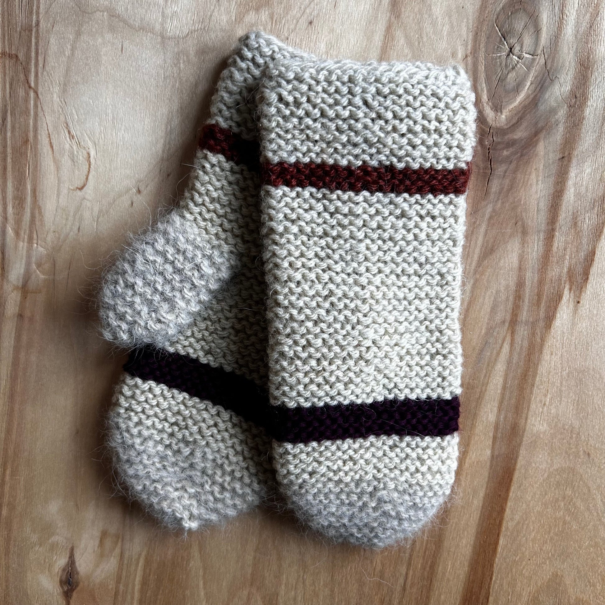 Rokām adīti bērnu dūrainīši dabīgas dzijas krāsā, ar divu toņu brūnām strīpām.