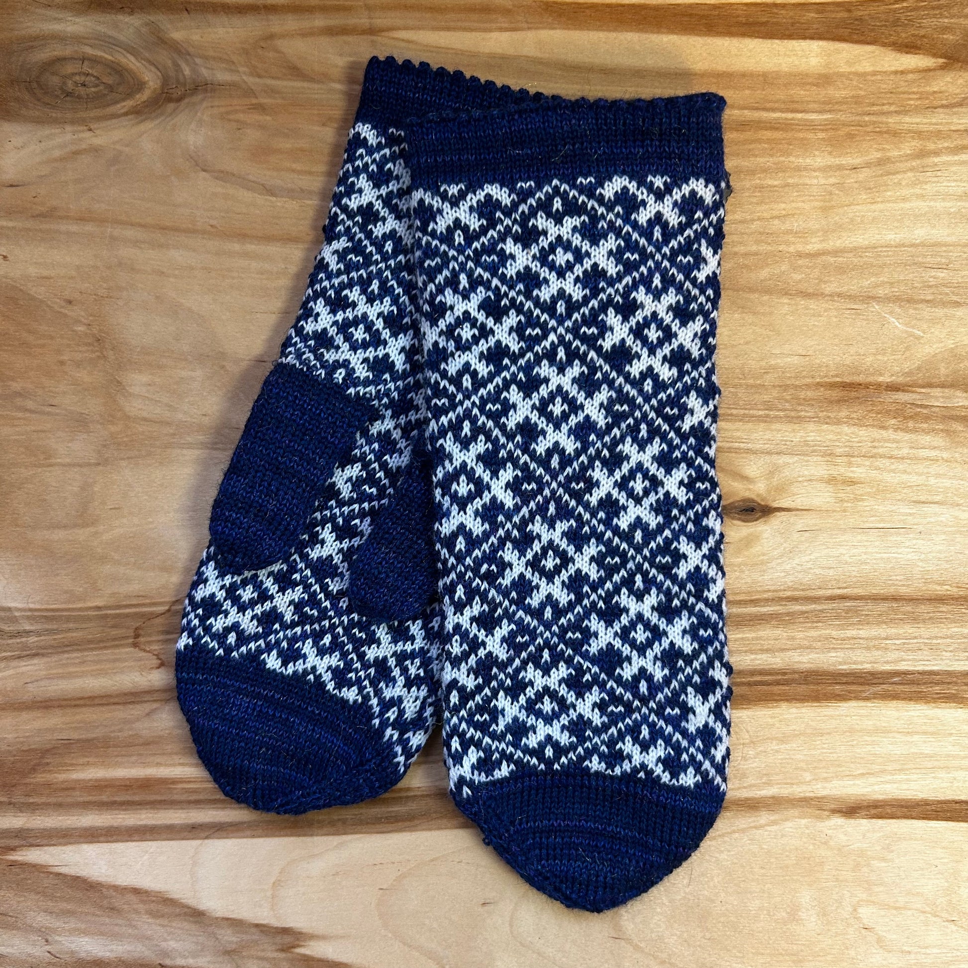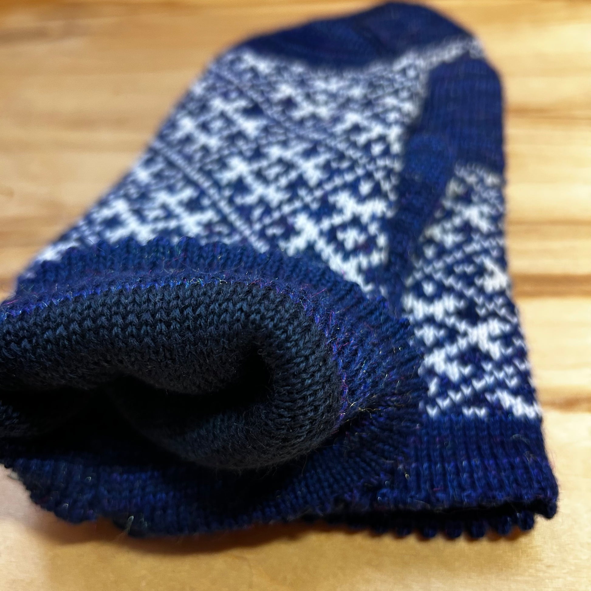 Ar adāmmašīnu līdzeni adīti dubultie dūraiņi zilā krāsā ar baltiem rakstiem un rombiņu adījumu gar valnīša malu. Īkšķa daļa zilā krāsā. 27 cm x 10 cm (garums x platums).