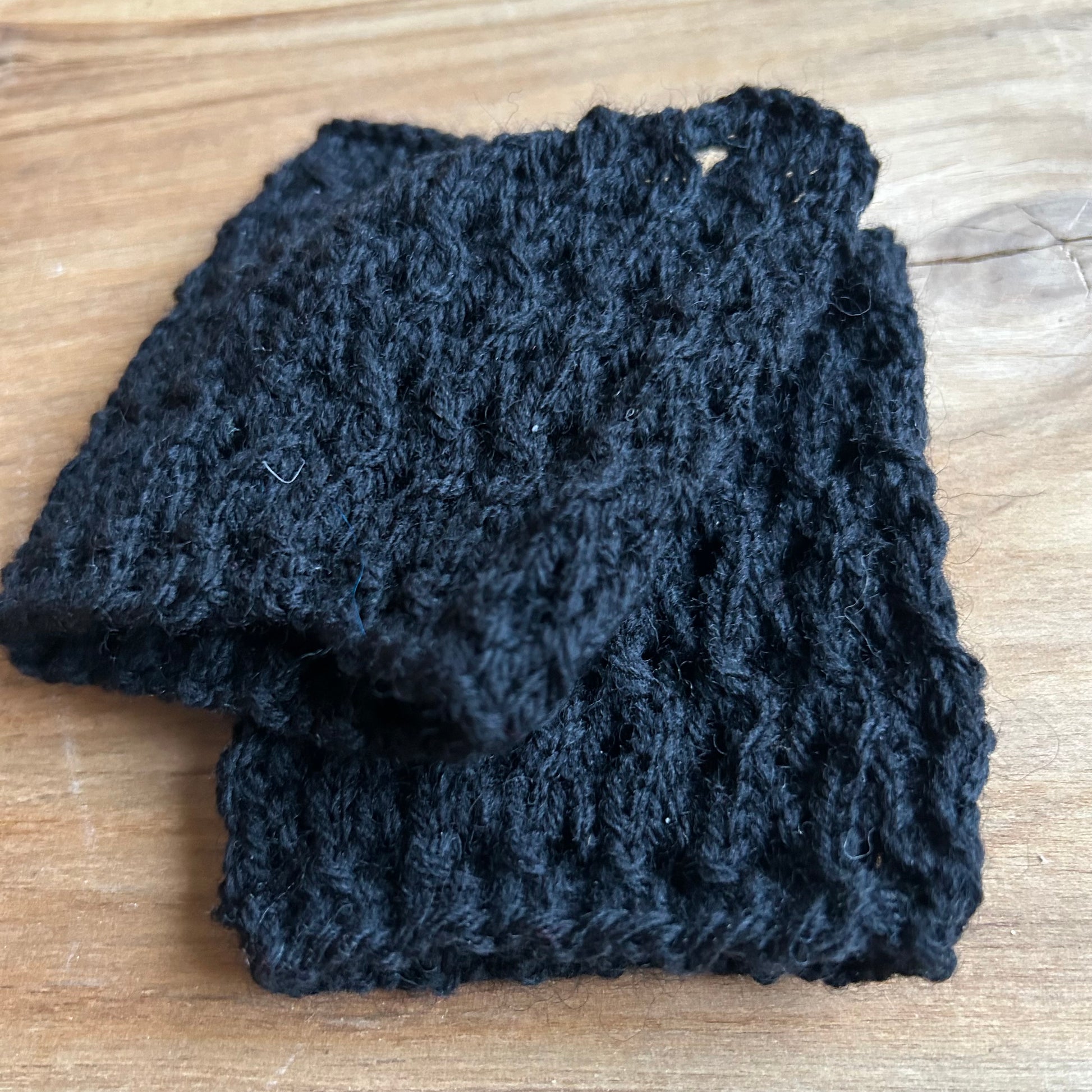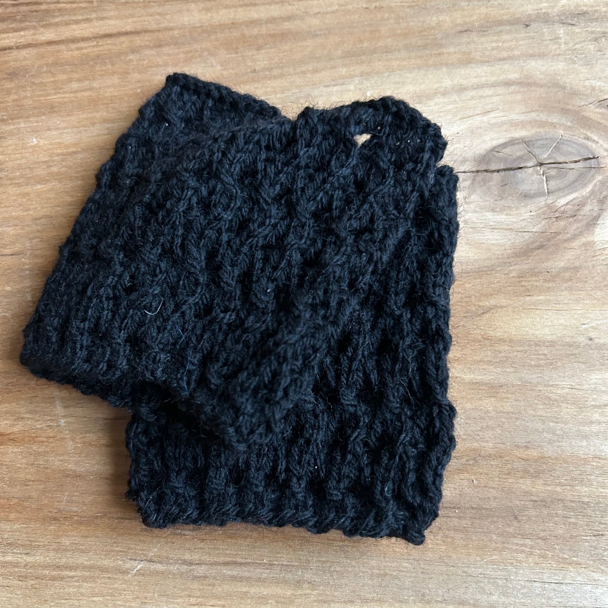 Rokām adīti mauči jeb pulsa sildītāji melnā krāsā. Izmērs - 10 cm augstums un 9 cm platums