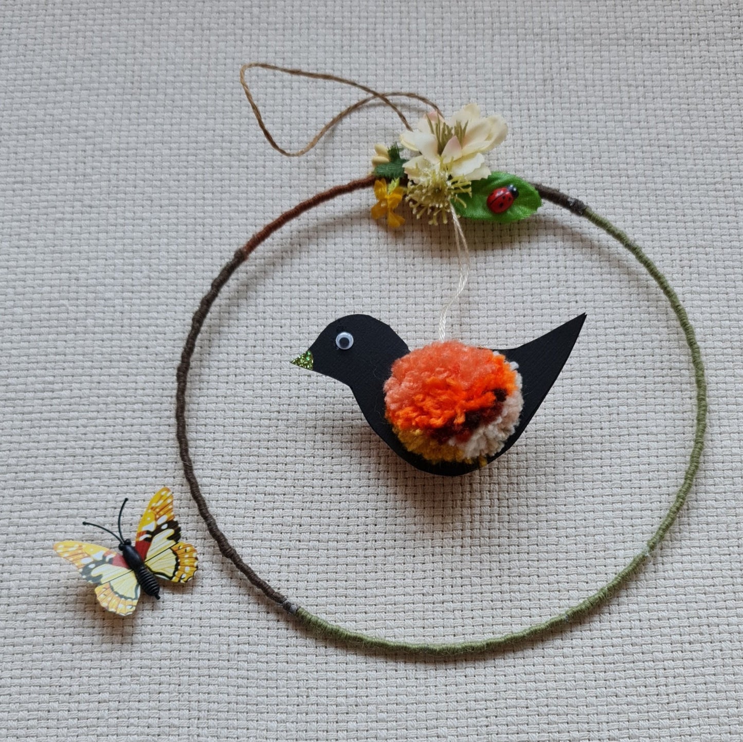 Dekors - magnētisks riņķis ar jebkurā vietā piestiprināmu tauriņu un melnu putniņu kuram ir oranžas / dzeltenas / brūnas / bēšas krāsas dziju vēderiņš.