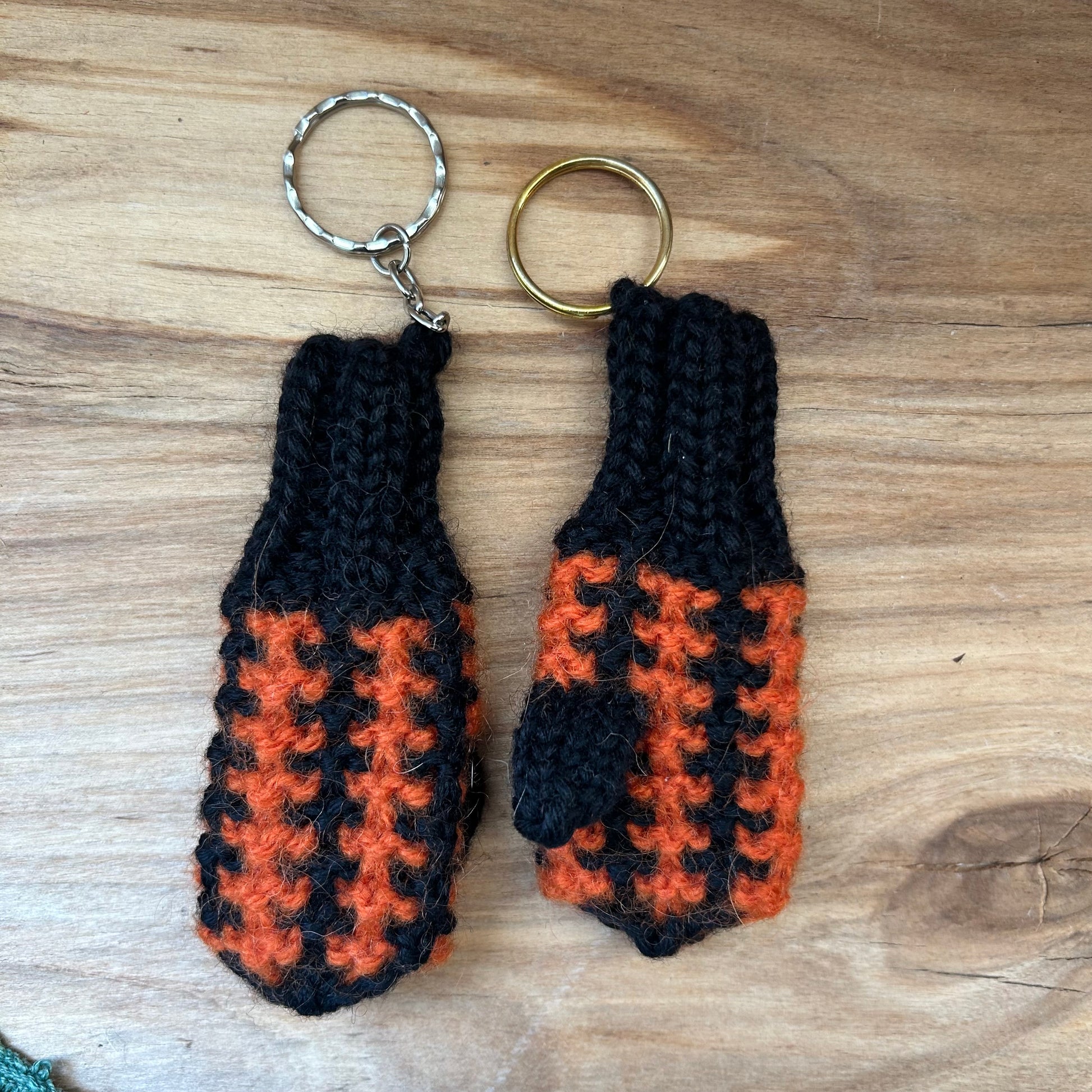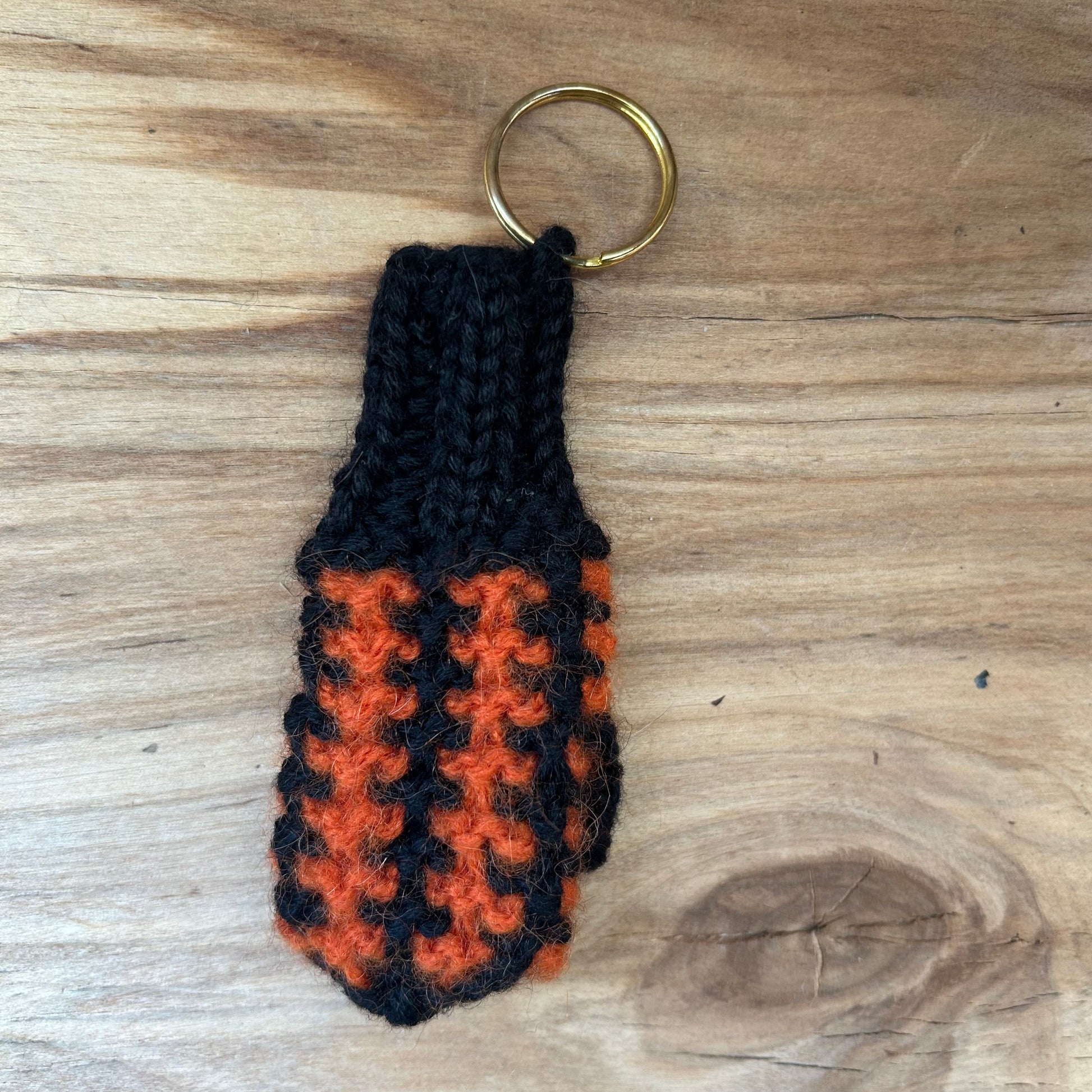 Rokām adīts dekoratīvs dūrainītis / atslēgu piekariņš melni oranžās krāsās. Cimdiņa augstums ~9cm / platums ~3,5cm.
