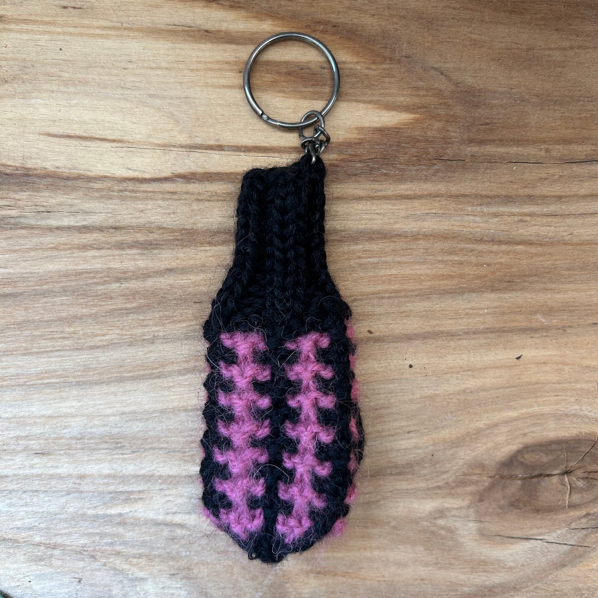 Neliels, ar rokām adīts piekariņš cimdiņa formā, aprīkots ar metāla gredzenu, lai to varētu pievienot pie atslēgām vai somas.