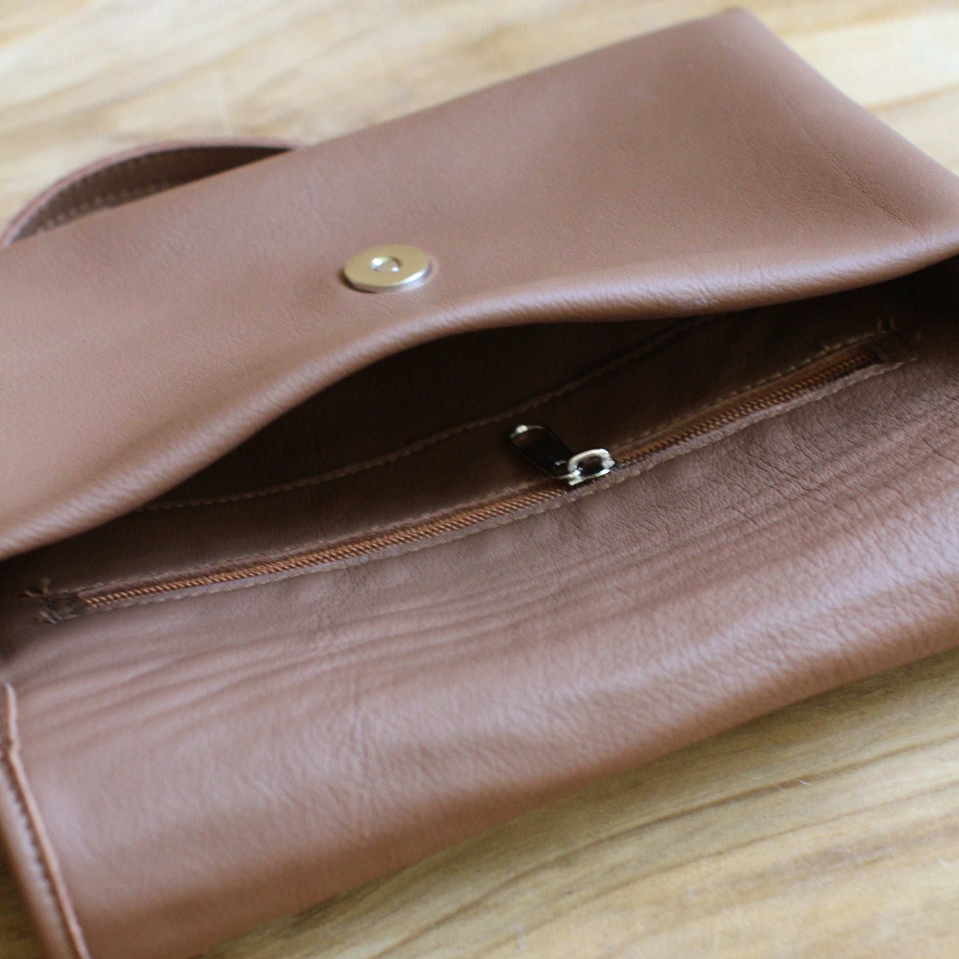 Rokām šūta, brūna dabīgās ādas soma. Somas izmēri ~ 22 x 16 cm, biezums pie pamata ~ 3 cm. Regulējama garuma plecu siksna 118-128 cm., rāvējslēdzēja aizdare, sudraba krāsas furnitūra, iekšpusē viena sānu kabata ar rāvējslēdzēja aizdari, brūna ādas odere.