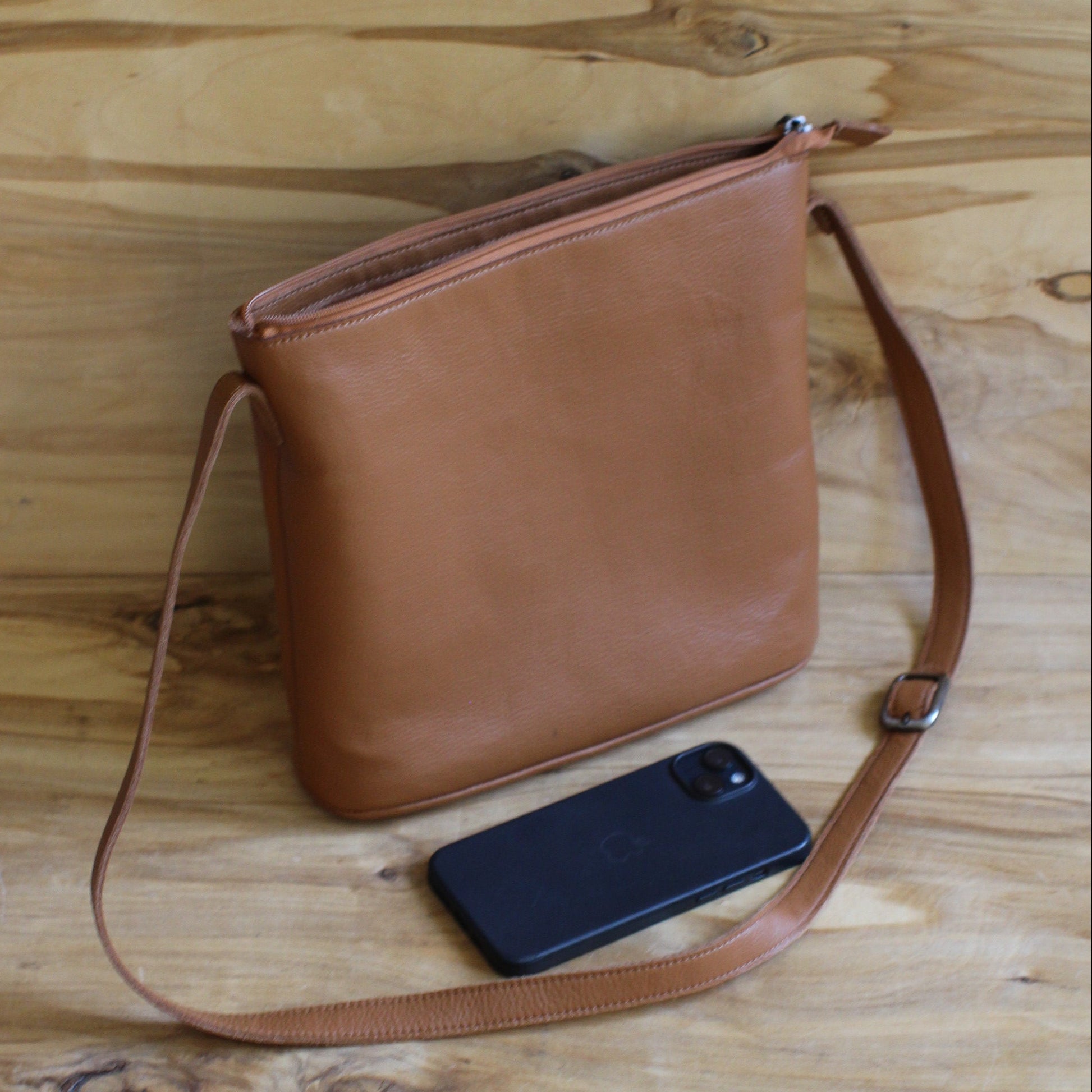 Rokām šūta, brūna dabīgās ādas soma. Somas izmēri ~ 27 x 24 cm, biezums pie pamata ~ 7 cm. Regulējama garuma plecu siksna 118-128 cm., rāvējslēdzēja aizdare, sudraba krāsas furnitūra, iekšpusē viena sānu kabata ar rāvējslēdzēja aizdari, brūna ādas odere.