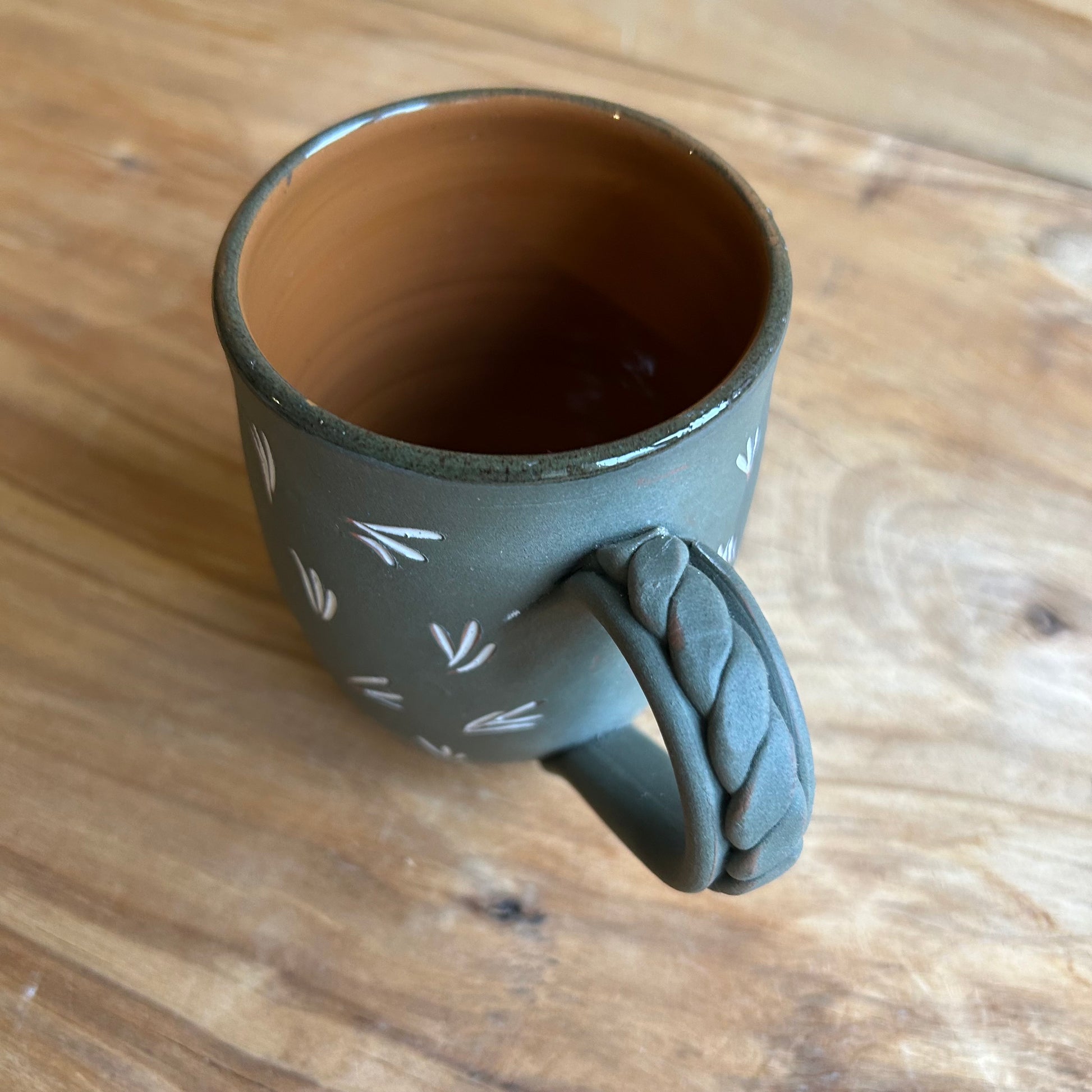 Rokām veidota tumšzaļa māla krūze ar brūnu glazētu iekšpusi, un baltiem ornamentiem, krūzes osiņai savīts raksts.