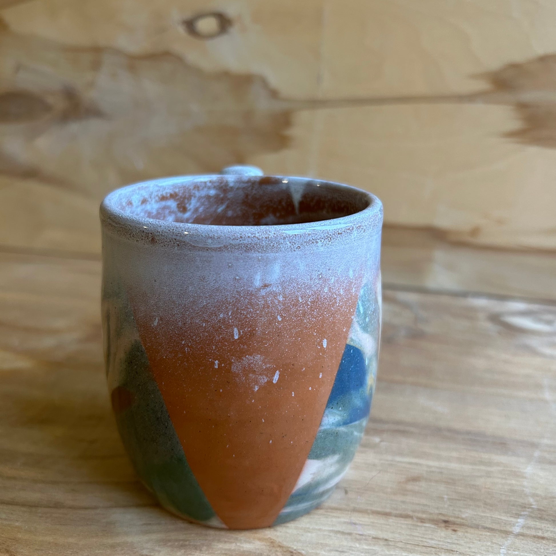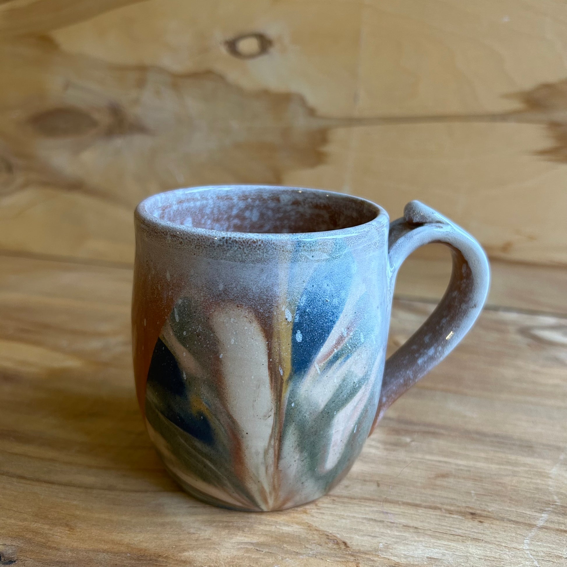 Rokām veidota brūna māla krūze ar glazētu iekšpusi, krāsainu ārējo glazūru un parocīgu veidojumu uz roktura. Krūzes augstums ~8 cm, diametrs ~8 cm, tilpums ~300 ml.