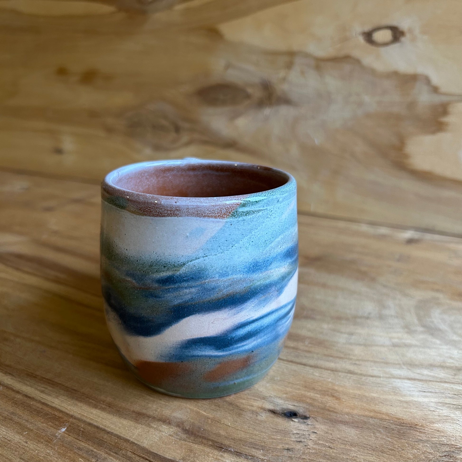 Rokām veidota brūna māla krūze ar glazētu iekšpusi, krāsainu ārējo glazūru un parocīgu veidojumu uz roktura. Krūzes augstums ~7,5 cm, diametrs ~7,5 cm, tilpums ~300 ml.