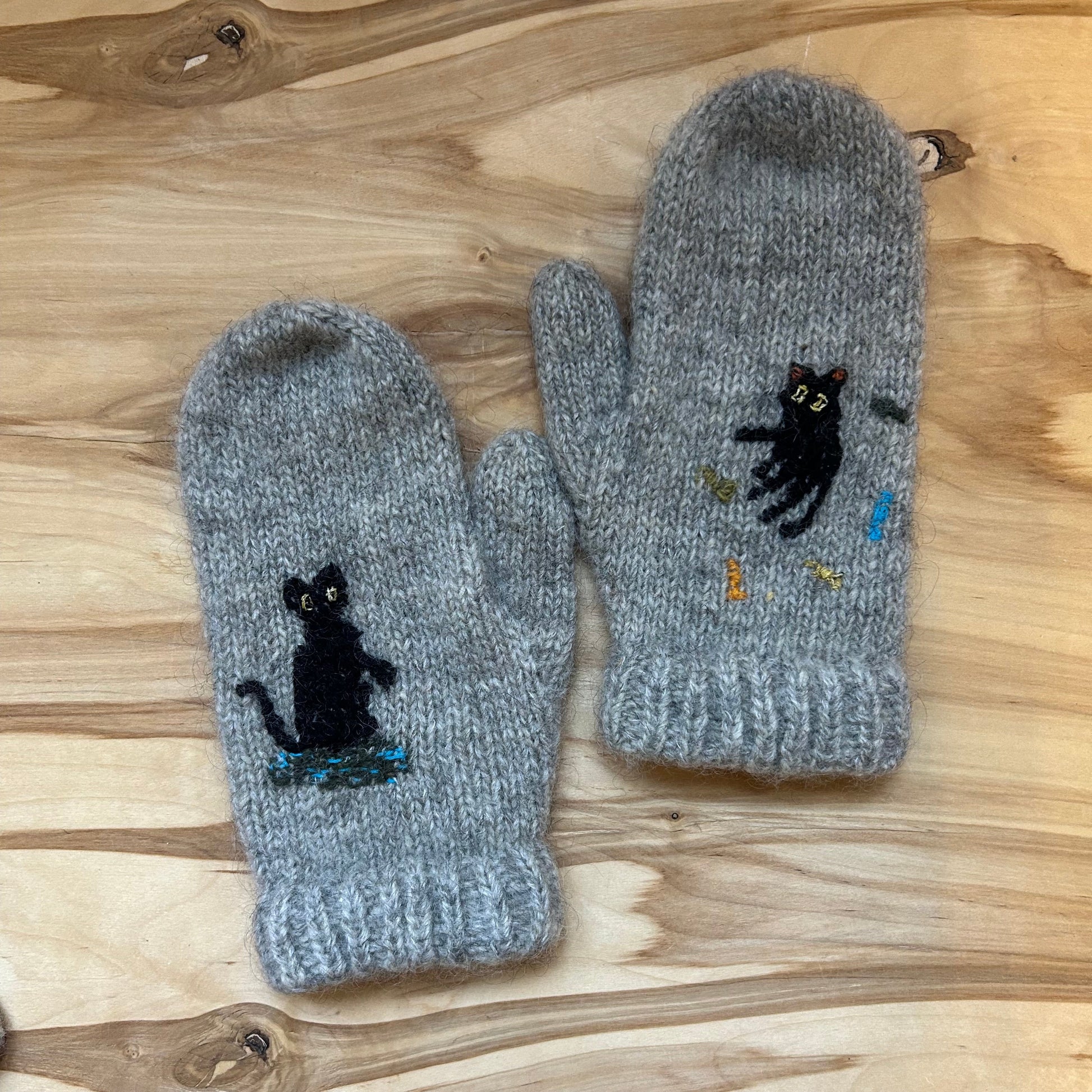 Rokām adīti pelēki dūraiņi ar uzšūtu zīmējumu uz katra cimda virspuses.